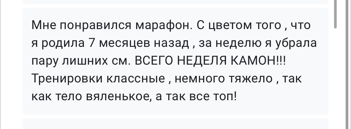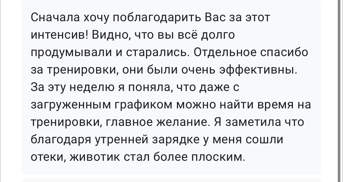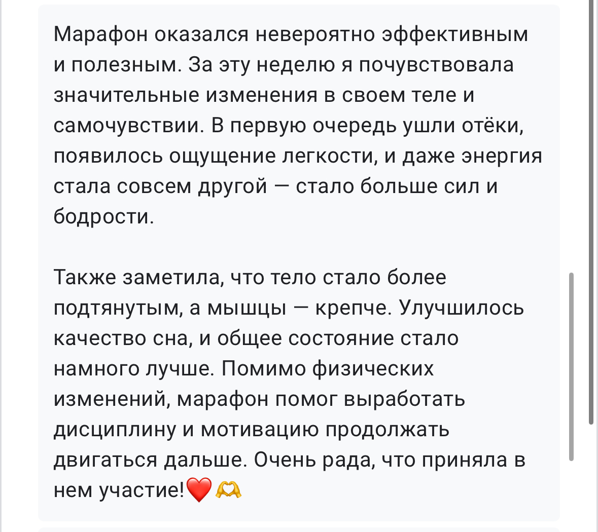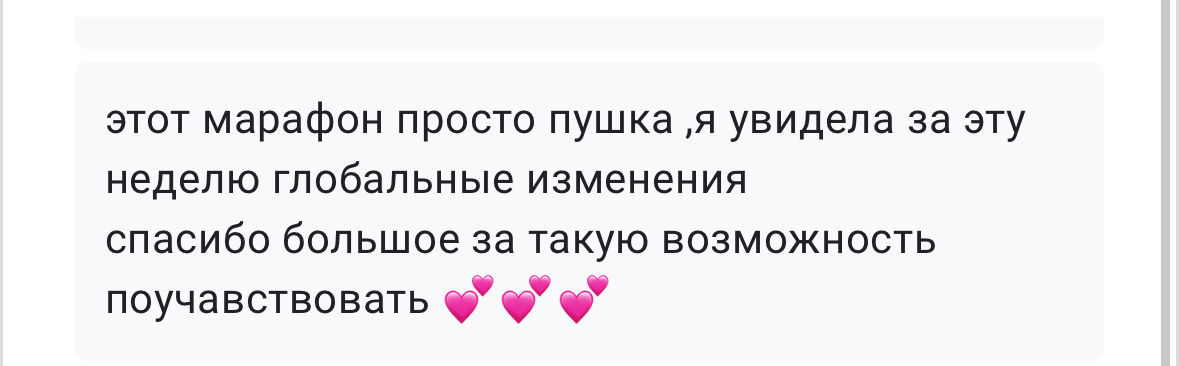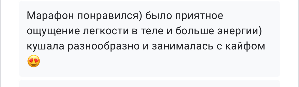 В течение курса у нас с вами будут "внутримарафоновские праздники" – например, дни полезных рецептов, лайфхаков или просто поднятия друг другу настроения – это поможет всем быть в потоке и ресурсе, а также узнать множество всего нового